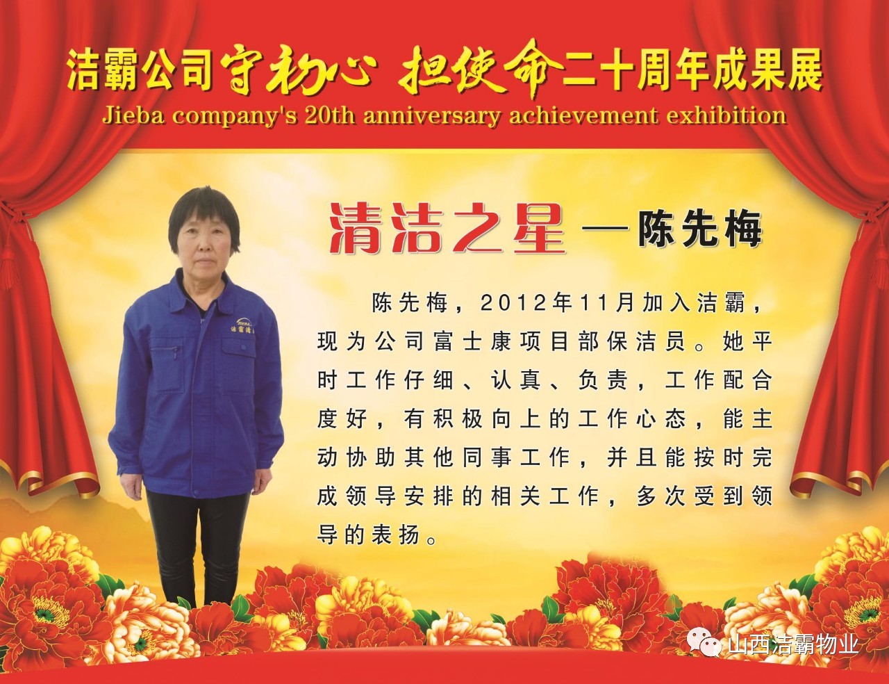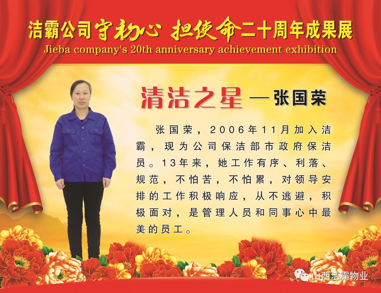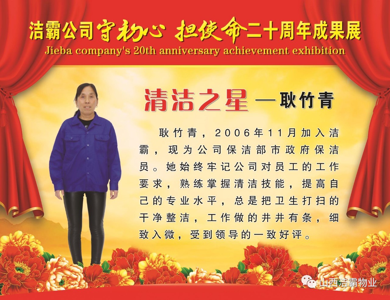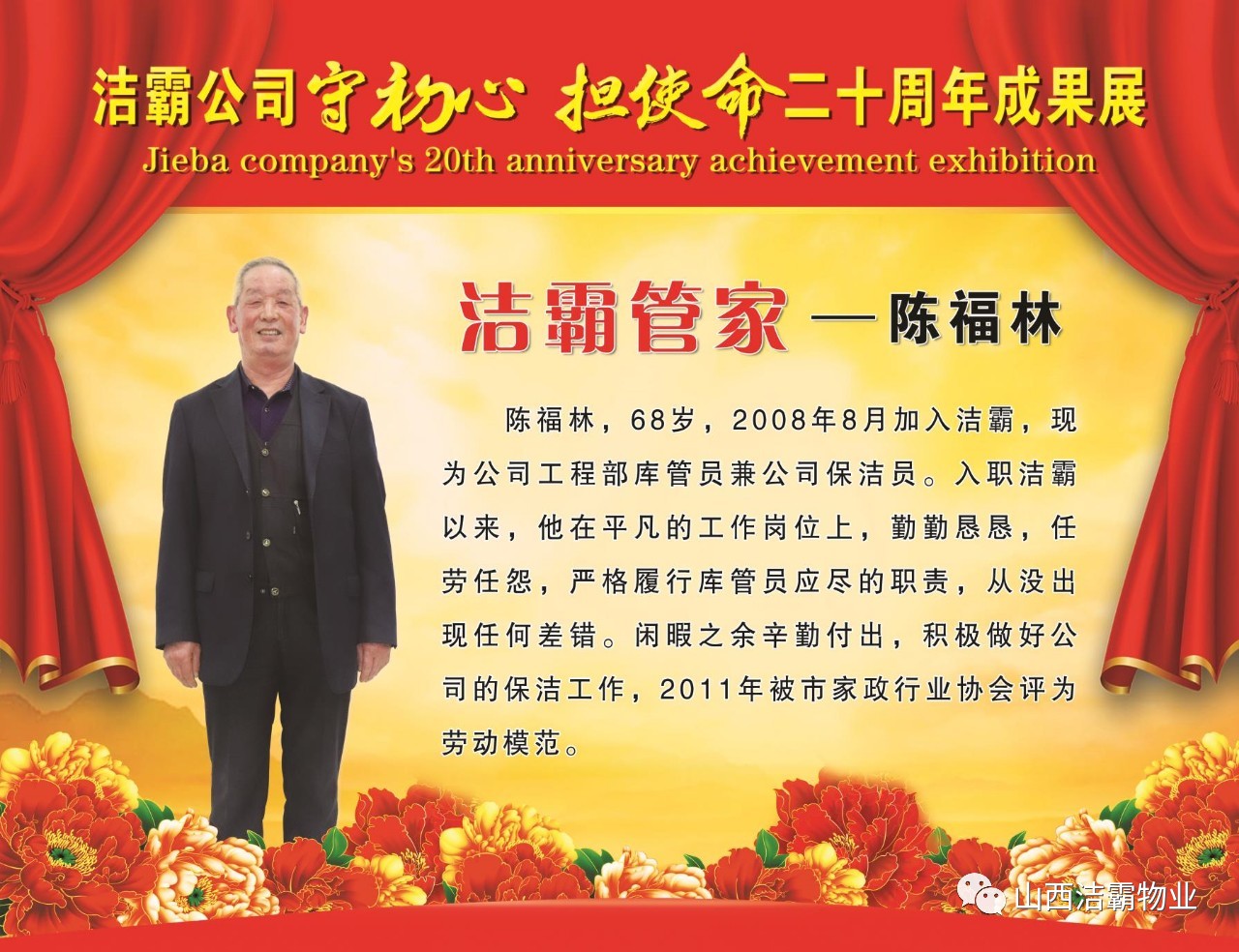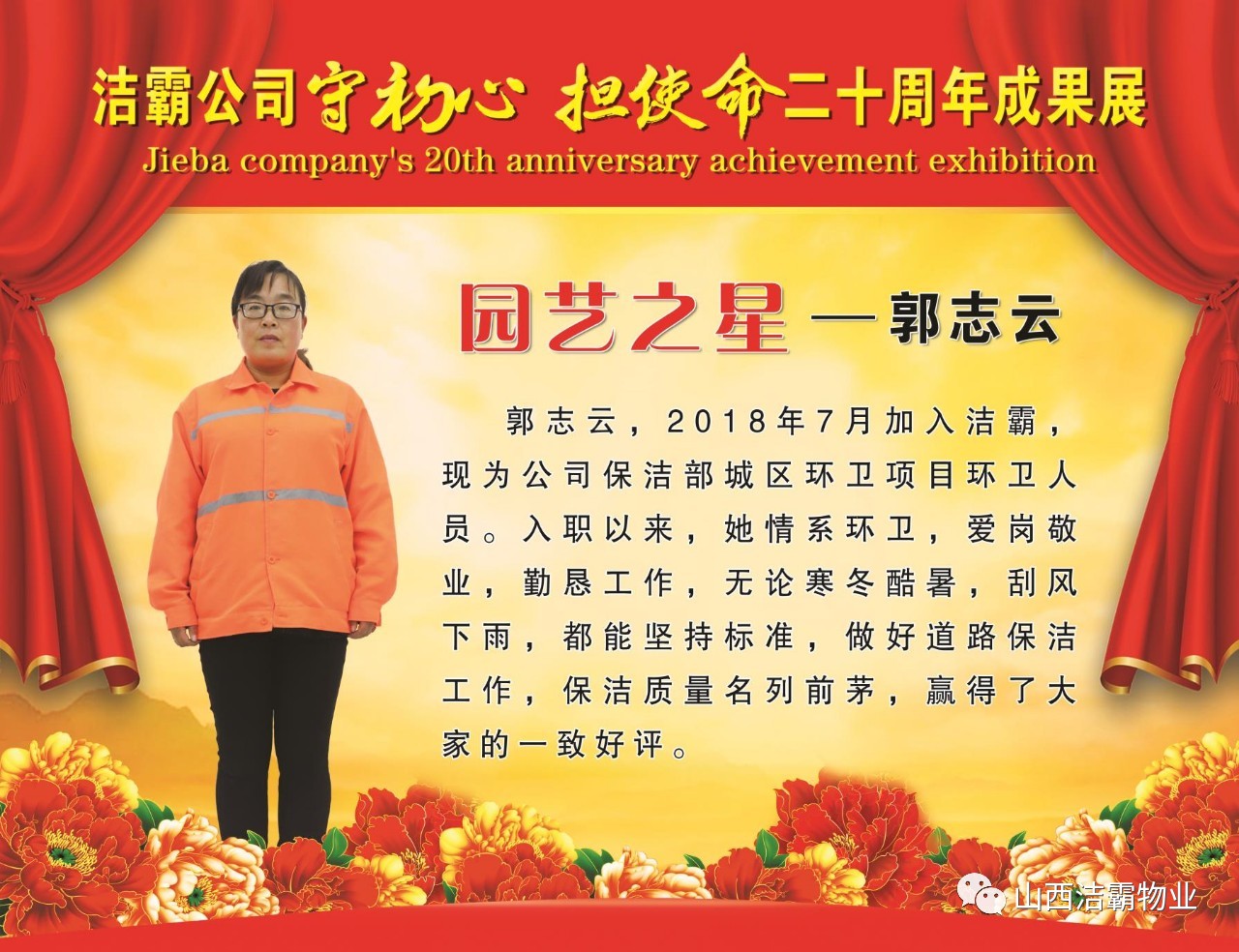 本次晚會以“潔霸二十華彰,感恩共創(chuàng)輝煌”為主題,此次慶典的核心思想是“感恩”,主要角色是潔霸的創(chuàng)業(yè)者。為此,公司對入職潔霸的創(chuàng)業(yè)功勛和一線員工進行了表彰獎勵。本次晚會共設8個獎項,包括“潔霸先鋒”“奉獻之星”“管理之星”“潔霸管家”“潔霸工匠”“清潔之星”“潔霸衛(wèi)士”“園藝之星”等。他們是:李山虎、張永智、史志霞、陳福林、王紅軍、余艷青、劉二丑、成艷粉、楊改梅、王書玲、張國榮、耿竹青、張粉霞、宋秋苗、陳先梅、張晉平、張偉山、趙瑞軍、王廣平、郭志云。晉城市原副市長成育廷、晉城市商務局原局長王新善、晉城市非公和社會組織工委書記郎軍芳、晉城市婦聯(lián)三級調研員李蓮菊、晉城市總工會商貿輕紡煙草服務業(yè)工會主席張玉濤、晉城市城區(qū)財政局局長翟明太等領導為他們頒獎。