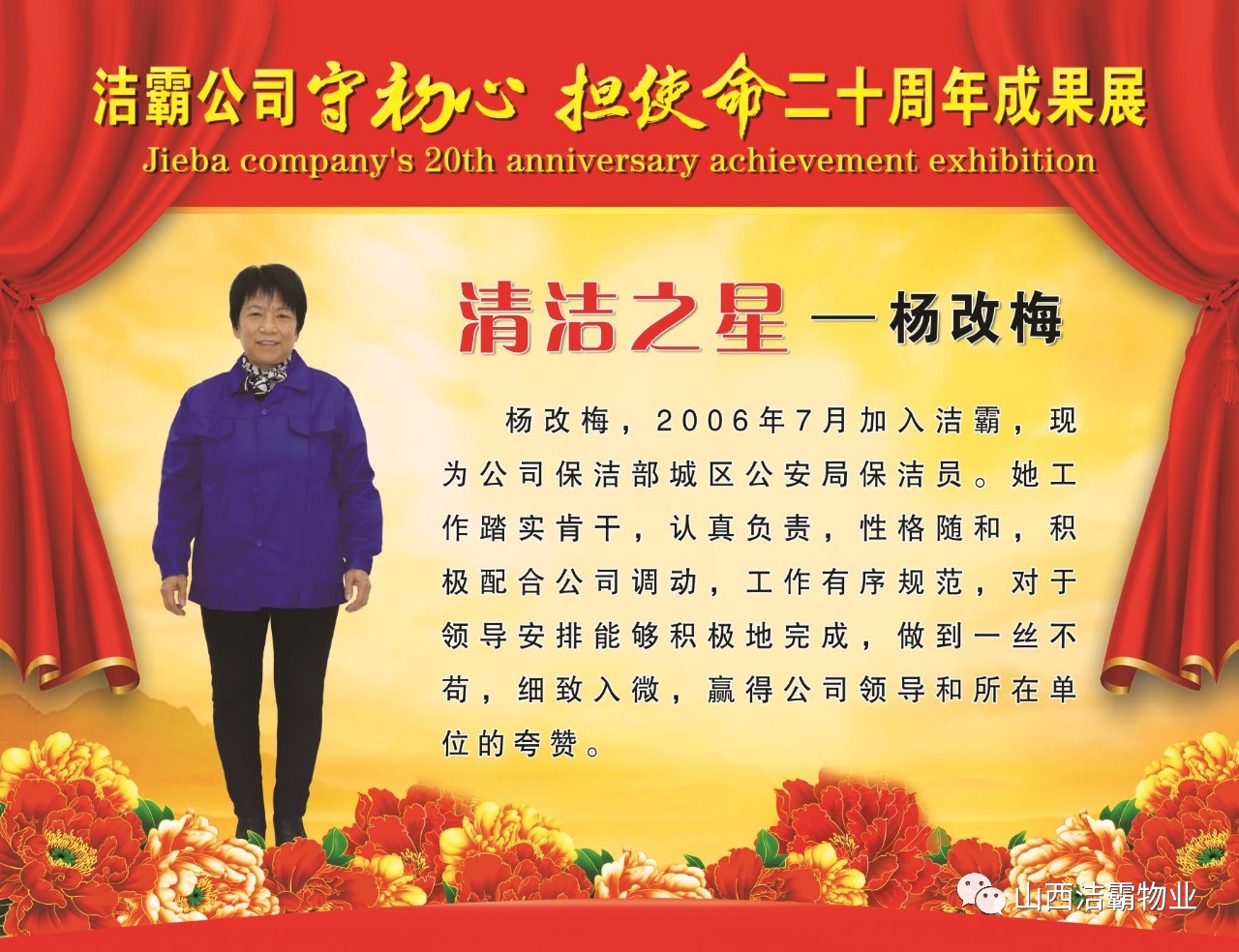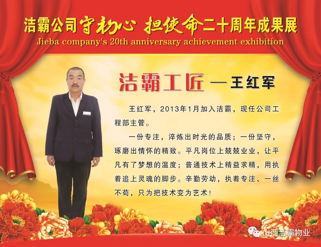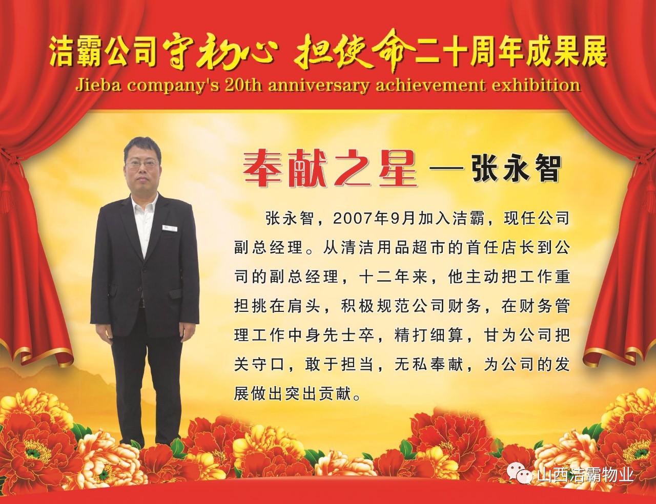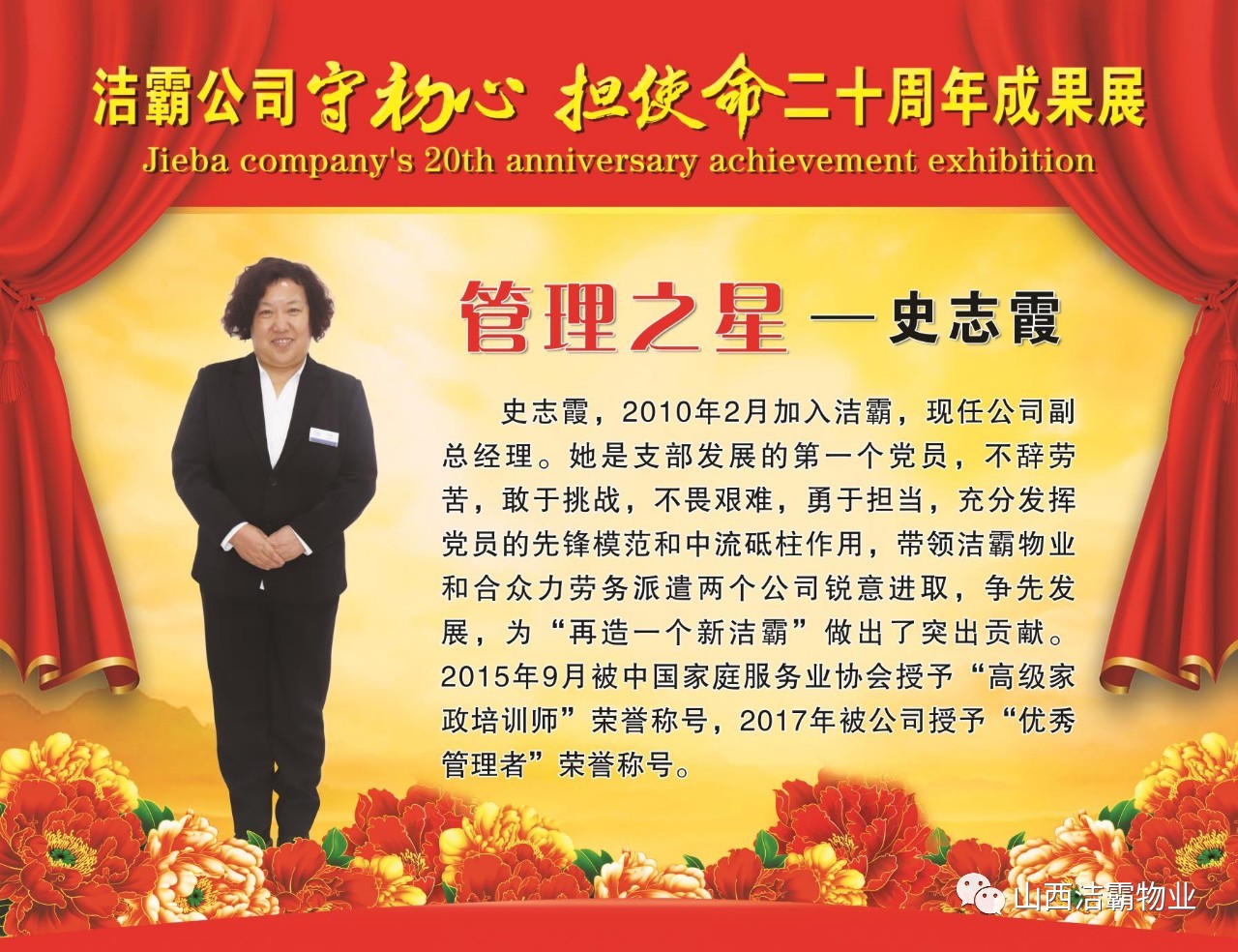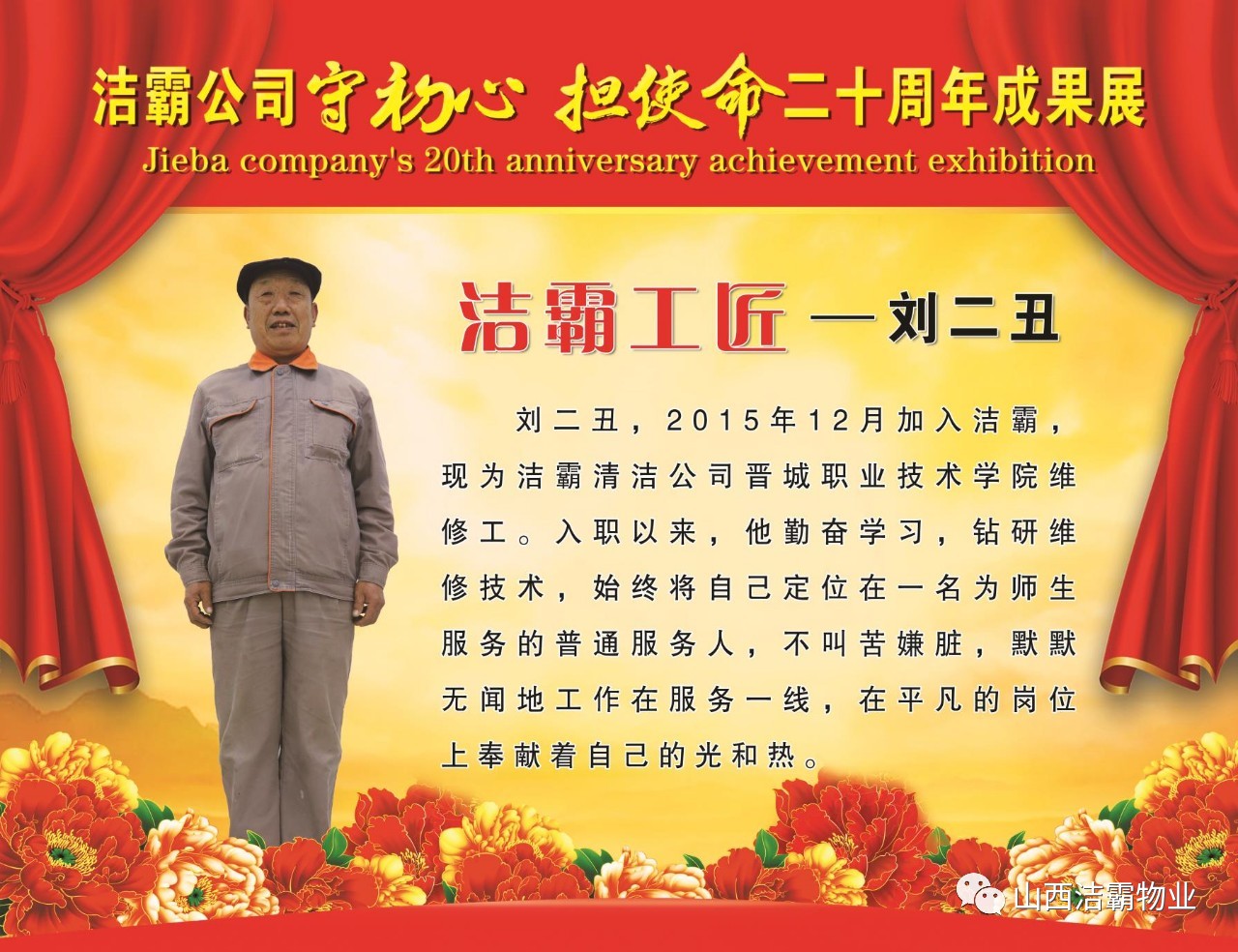 本次晚會以“潔霸二十華彰,感恩共創(chuàng)輝煌”為主題,此次慶典的核心思想是“感恩”,主要角色是潔霸的創(chuàng)業(yè)者。為此,公司對入職潔霸的創(chuàng)業(yè)功勛和一線員工進行了表彰獎勵。本次晚會共設8個獎項,包括“潔霸先鋒”“奉獻之星”“管理之星”“潔霸管家”“潔霸工匠”“清潔之星”“潔霸衛(wèi)士”“園藝之星”等。他們是:李山虎、張永智、史志霞、陳福林、王紅軍、余艷青、劉二丑、成艷粉、楊改梅、王書玲、張國榮、耿竹青、張粉霞、宋秋苗、陳先梅、張晉平、張偉山、趙瑞軍、王廣平、郭志云。晉城市原副市長成育廷、晉城市商務局原局長王新善、晉城市非公和社會組織工委書記郎軍芳、晉城市婦聯(lián)三級調研員李蓮菊、晉城市總工會商貿輕紡煙草服務業(yè)工會主席張玉濤、晉城市城區(qū)財政局局長翟明太等領導為他們頒獎。