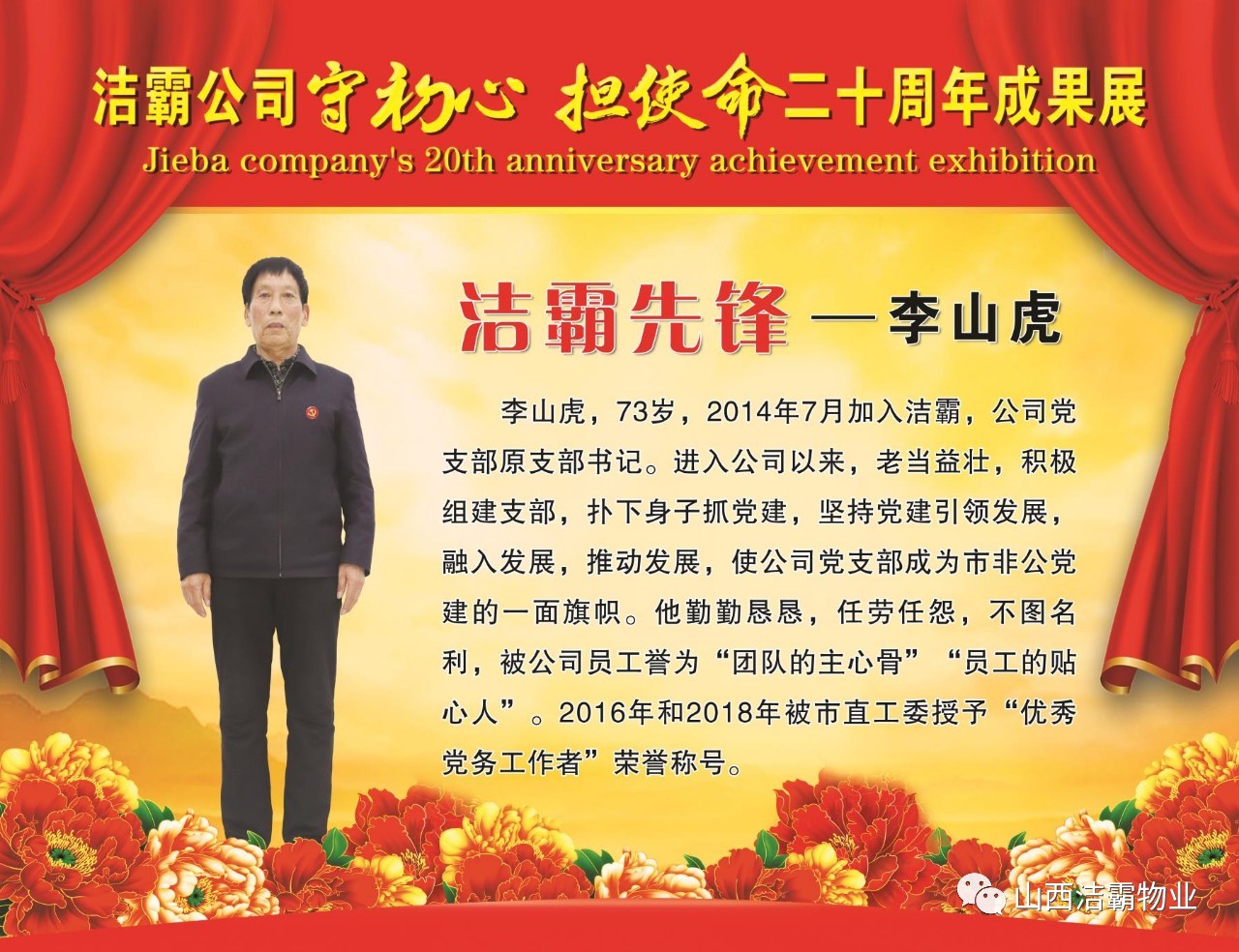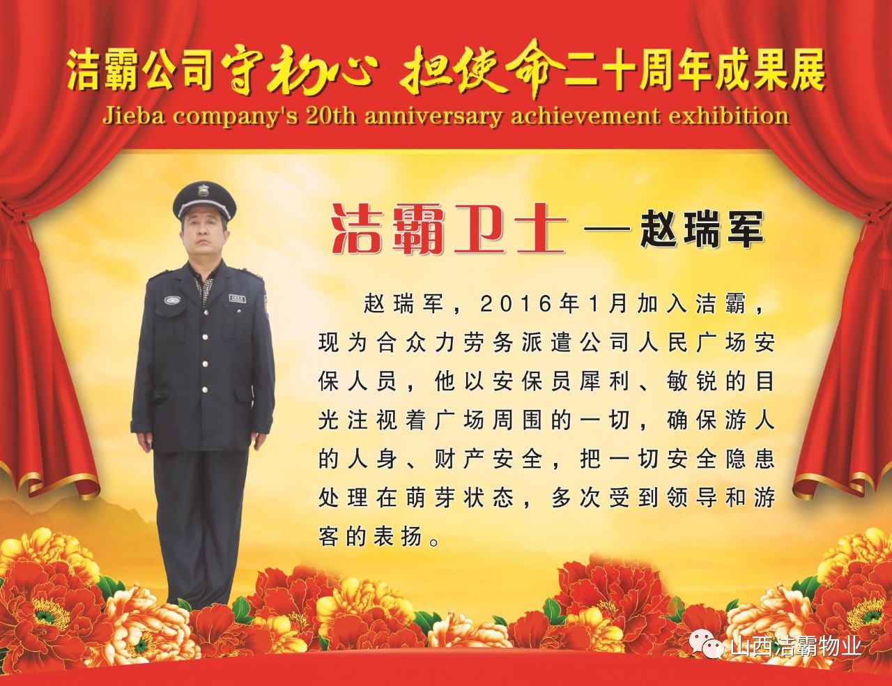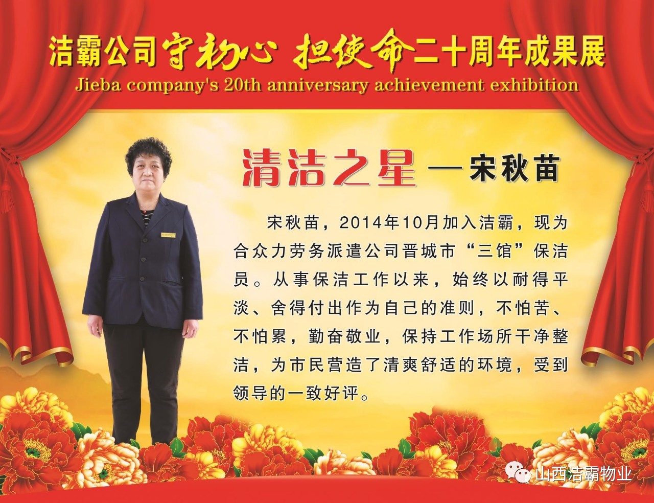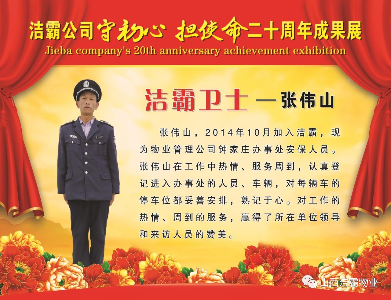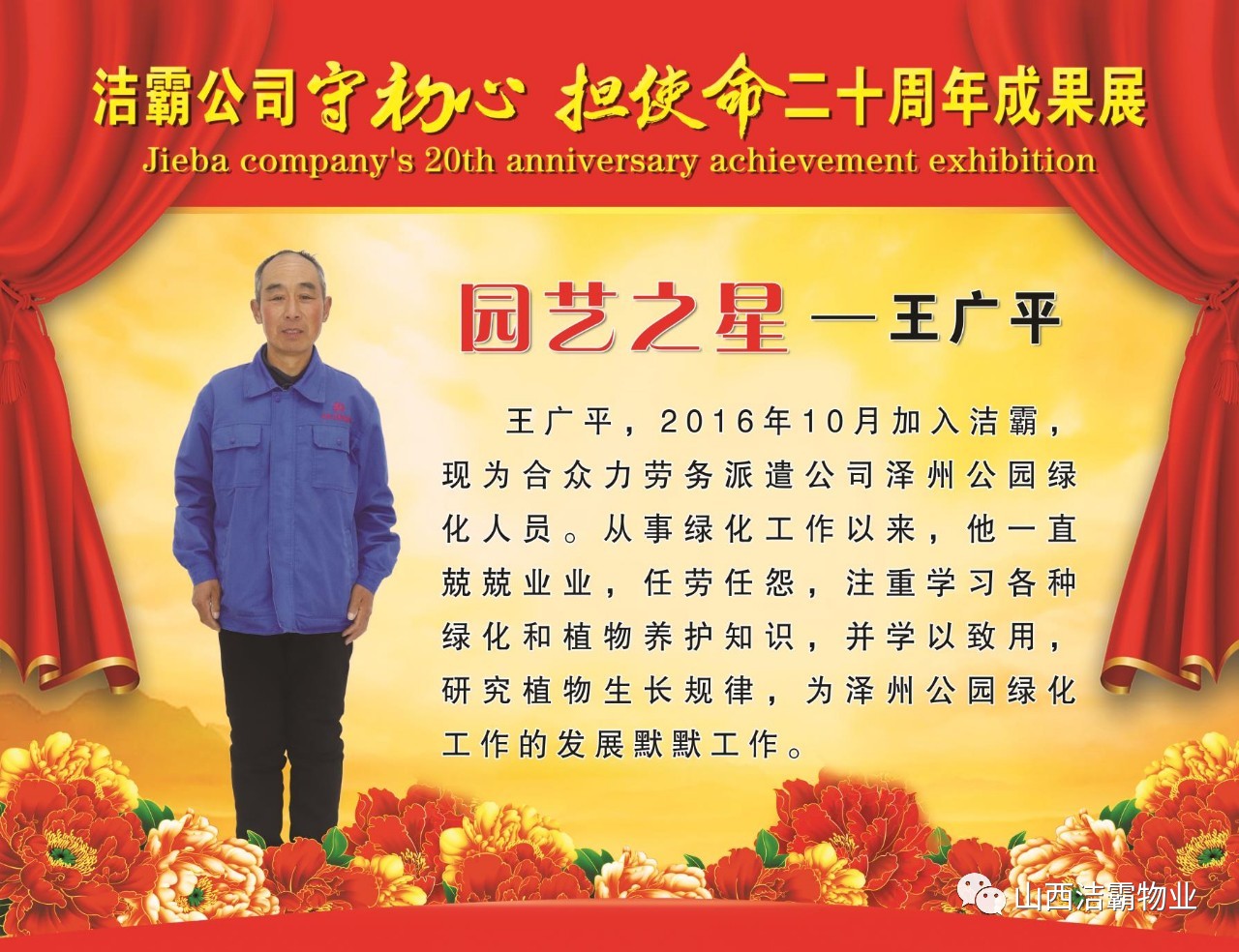 本次晚會以“潔霸二十華彰,感恩共創(chuàng)輝煌”為主題,此次慶典的核心思想是“感恩”,主要角色是潔霸的創(chuàng)業(yè)者。為此,公司對入職潔霸的創(chuàng)業(yè)功勛和一線員工進行了表彰獎勵。本次晚會共設8個獎項,包括“潔霸先鋒”“奉獻之星”“管理之星”“潔霸管家”“潔霸工匠”“清潔之星”“潔霸衛(wèi)士”“園藝之星”等。他們是:李山虎、張永智、史志霞、陳福林、王紅軍、余艷青、劉二丑、成艷粉、楊改梅、王書玲、張國榮、耿竹青、張粉霞、宋秋苗、陳先梅、張晉平、張偉山、趙瑞軍、王廣平、郭志云。晉城市原副市長成育廷、晉城市商務局原局長王新善、晉城市非公和社會組織工委書記郎軍芳、晉城市婦聯(lián)三級調研員李蓮菊、晉城市總工會商貿輕紡煙草服務業(yè)工會主席張玉濤、晉城市城區(qū)財政局局長翟明太等領導為他們頒獎。