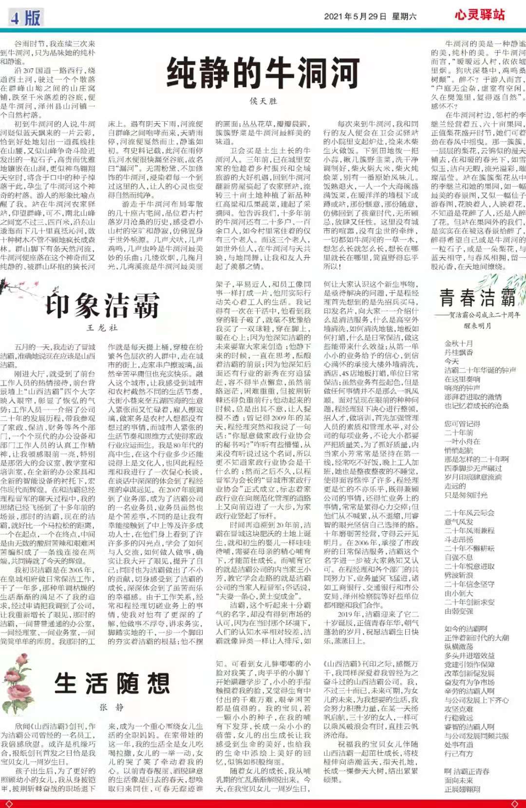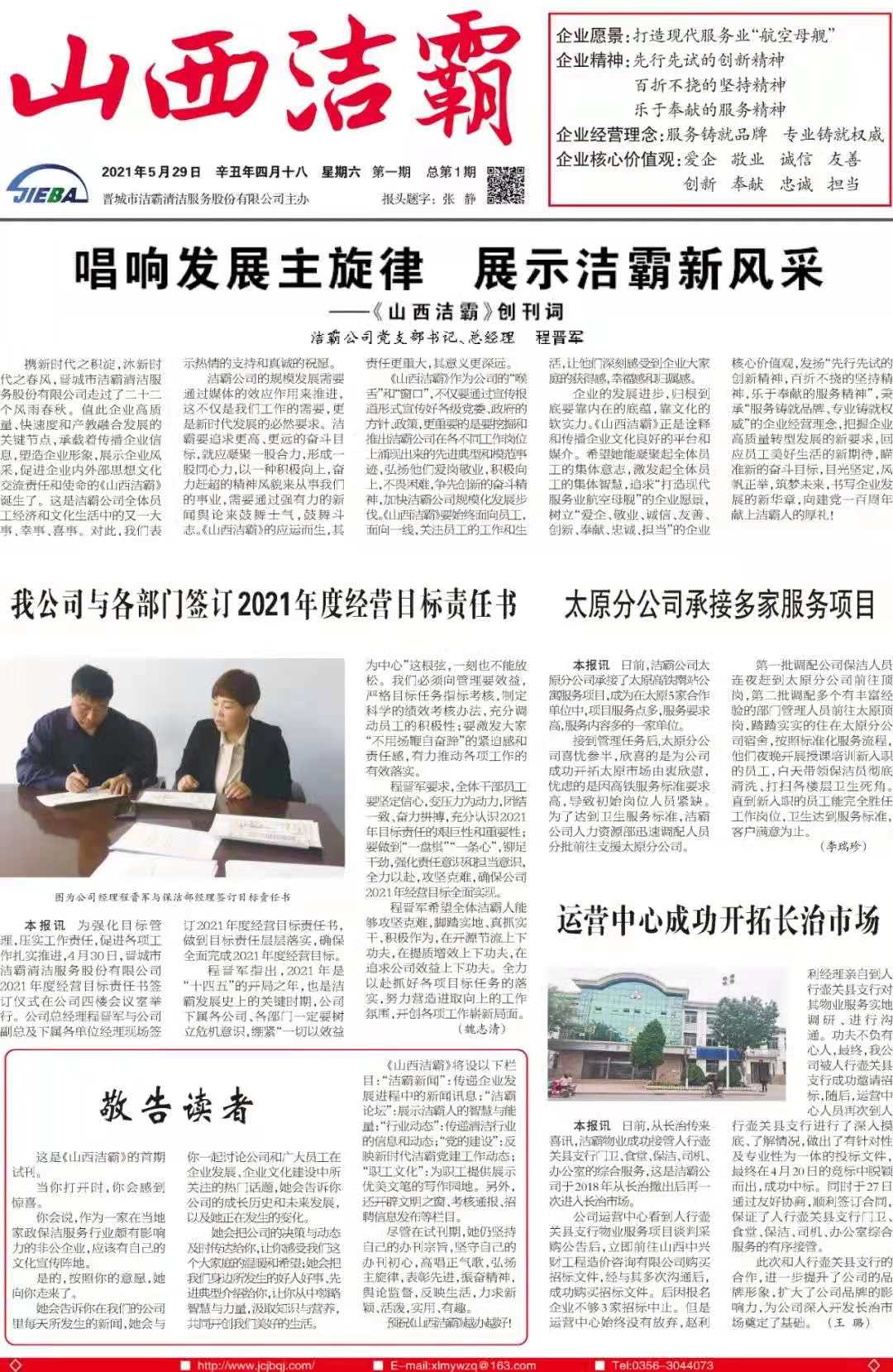 今天是2021年5月29日,經(jīng)過(guò)一個(gè)多月的緊張籌辦,《山西潔霸》報(bào)紙終于創(chuàng)刊啦!這是潔霸人的一件大喜事,也是潔霸人的驕傲!伴隨著《山西潔霸》紙質(zhì)版的內(nèi)部發(fā)行,電子版也同步與你見(jiàn)面了。希望你能通過(guò)這個(gè)宣傳窗口,更好地走近潔霸,了解潔霸,關(guān)注潔霸,支持潔霸。