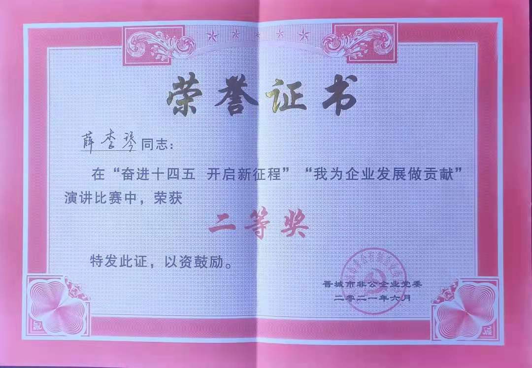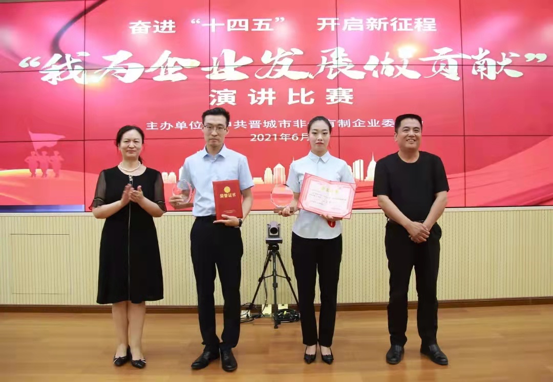 6月2日下午,晉城市非公企業(yè)黨委“奮進(jìn)十四五·開啟新征程 我為企業(yè)發(fā)展做貢獻(xiàn)”主題演講比賽決賽在市市場監(jiān)督管理局6樓視頻會(huì)議室成功舉行。我公司選手薛李琴在決賽中榮獲二等獎(jiǎng)。