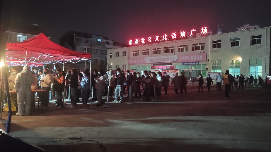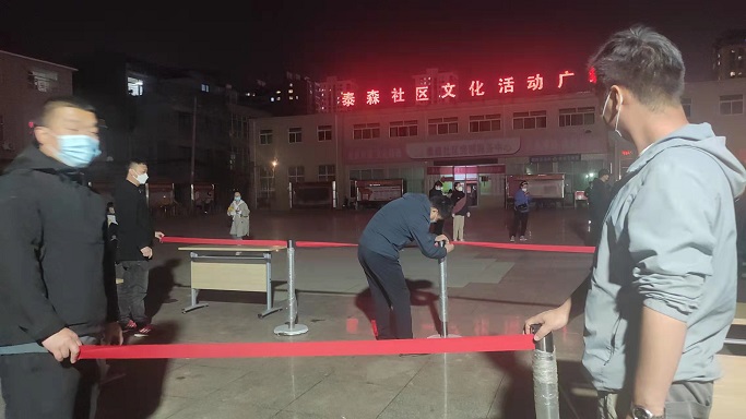 在泰森社區(qū)文化活動(dòng)廣場(chǎng),志愿者們擺桌子、拉警戒線(xiàn)、撐帳篷,齊心合力協(xié)助社區(qū)工作人員完成核酸檢測(cè)采樣點(diǎn)位設(shè)置及物資配備,同時(shí)積極引導(dǎo)社區(qū)居民進(jìn)行掃碼登記、測(cè)量體溫,提醒社區(qū)居民全程佩戴口罩,在排隊(duì)期間保持一米間距,組織居民做好分組,提前亮碼,核酸檢測(cè)完成后有序離場(chǎng)。雖然天氣較冷,但志愿者們毫無(wú)怨言,服務(wù)熱情很高,直至晚上12點(diǎn),協(xié)助社區(qū)完成了9000余人的核酸檢測(cè)工作。