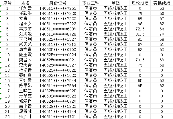 晉城市潔霸清潔服務(wù)股份有限公司職業(yè)技能等級(jí)認(rèn)定中心現(xiàn)將2024年9月15日認(rèn)定人員成績公示如下: