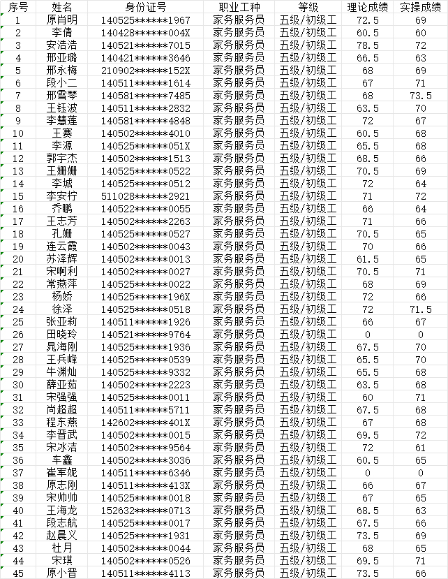 晉城市潔霸清潔服務(wù)股份有限公司職業(yè)技能等級(jí)認(rèn)定中心現(xiàn)將2024年9月28日認(rèn)定人員成績(jī)公示如下: